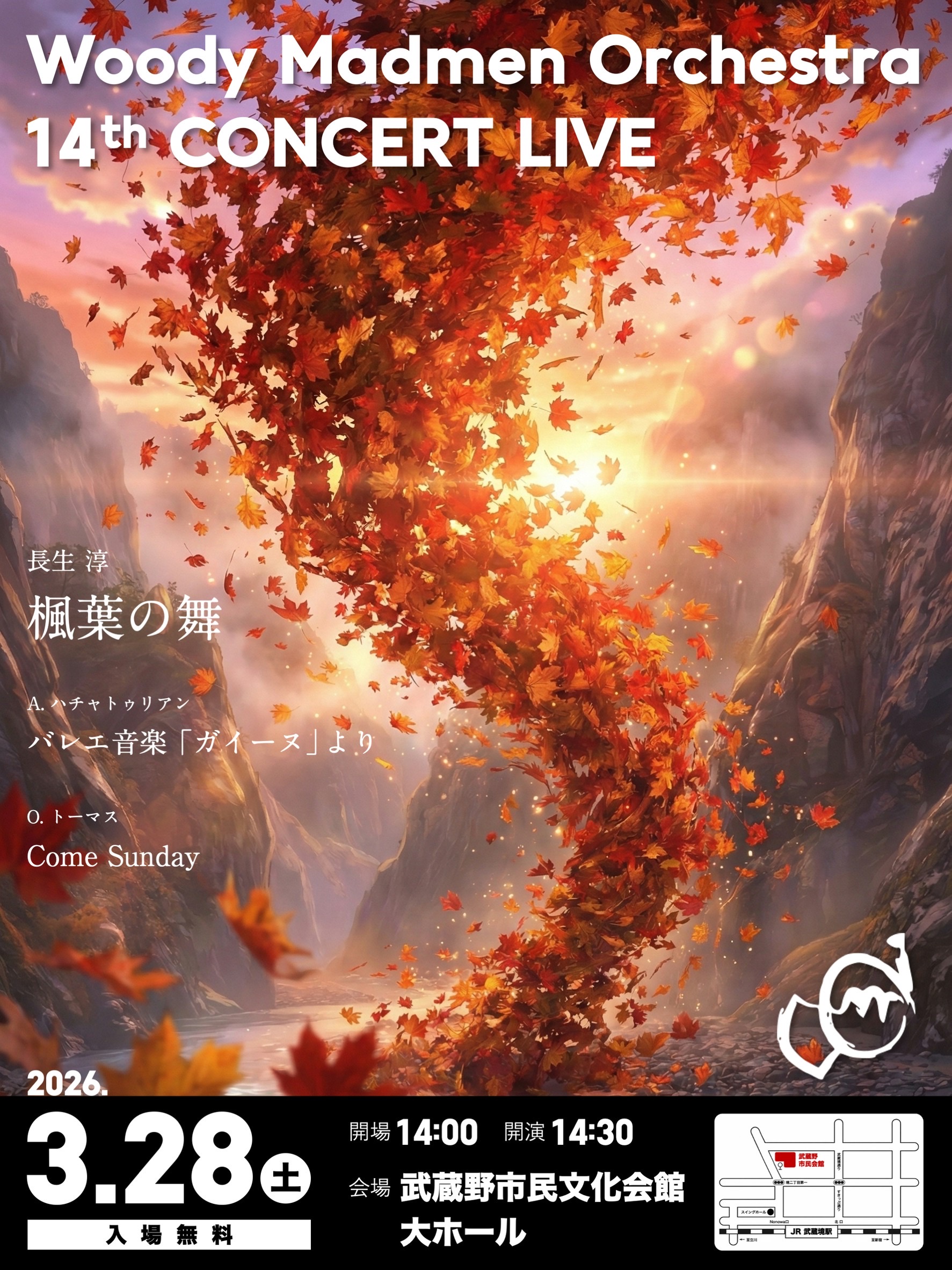 Woody Madmen Orchestra The 14th Concert Live 日時: 2026/3/28(土) 14:00開場 14:30開演 会場: 武蔵野市民文化会館 大ホール 入場料: 無料・全席自由席 プログラム: 楓葉の舞、バレエ音楽「ガイーヌ」より、Come Sunday、他 皆様のご来場を団員一同、心よりお待ちしております。